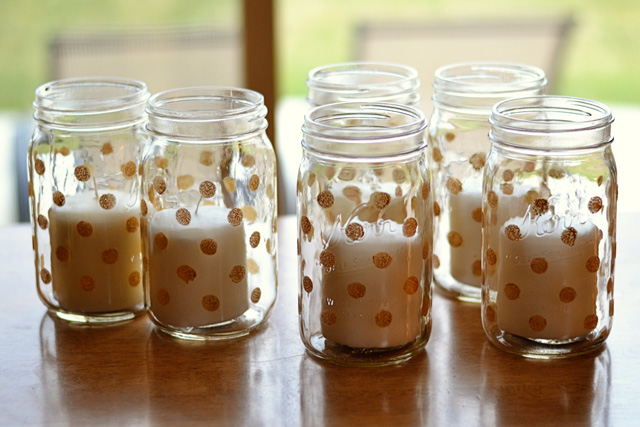 Everything was gold and silver, with lots of white and glass to complement it, and plenty of candlelight. I painted gold dots on canning jars and used those as centerpieces with candles inside, then layered various baking cups and tied that around the jar, finishing it off with sequins in the middle.